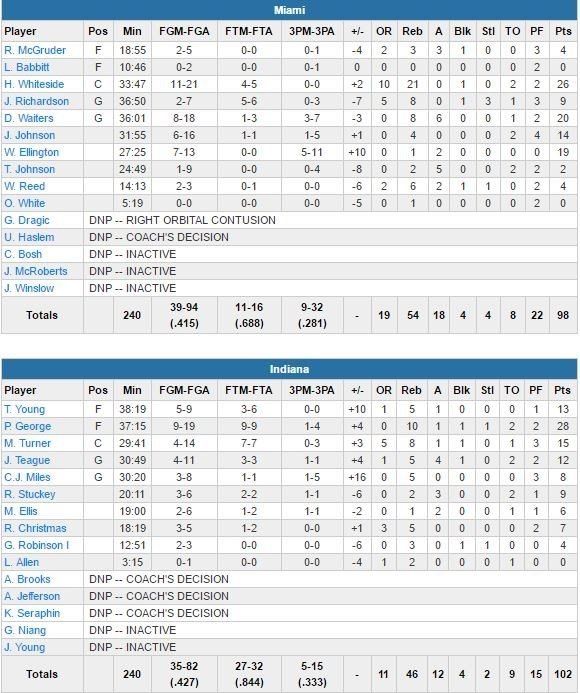 Mené 93-85 à 6’09 et pendant près de 3 quarts-temps et demi, Miami avait réussi à reprendre les commandes sur un shoot de Dion Waiters (20 points à 8/18, 8 rebonds et 6 passes) à 3’24. Indiana avait ensuite répondu par un 6-0 pour mettre le match hors de portée et stopper la série de 4 victoires du Heat.