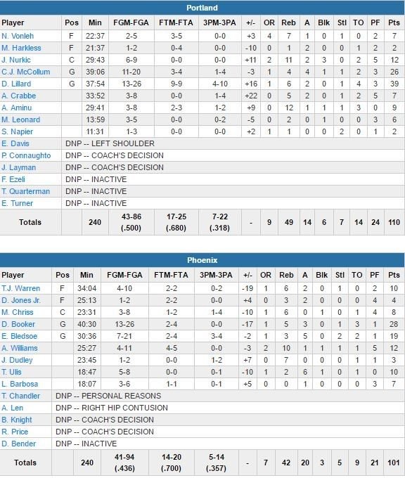 Devin Booker termine à 28 points (13/26, 5 rebonds et 3 passes) pour les Suns, Eric Bledsoe 19 (7/21, 3 rebonds et 5 passes). Lillard plante 15 points dans le 1er quart-temps et Portland passe un 15-0 à ses adversaires après avoir été mené 16-12 en début de match. Après 12 minutes, l’équipe visiteuse est devant 33-18. Phoenix revient à 6 points dans le 2ème quart mais les Blazers finissent fort leur 1ère mi-temps et reprennent 16 points d’avance sur un layup de Lillard suite à une interception, 66-50. À la pause, Portland shoote mieux au général (63.4%) qu’aux lancers-francs (58.8%) !