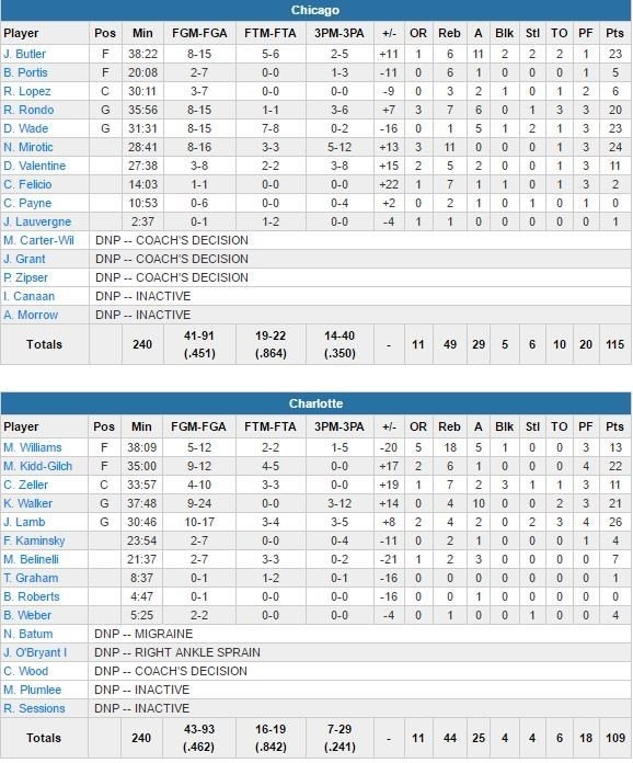 Nicolas Batum absent (migraine), Jeremy Lamb a bien comblé le vide avec 26 points à 10/17, 4 rebonds et 2 passes pour accompagner Michael Kidd-Gilchrist (22 points à 9/12), Kemba Walker (21 points à 9/24 et 10 passes) et Marvin Williams (13 points à 5/12, 18 rebonds et 5 passes). Rondo dans le cinq majeur à la place de Jerian Grant, Chicago score 36 points dans le 1er quart-temps après un 8/13 à 3-points, dont 3 pour l’ex-Celtic, qui distribue aussi 3 passes sur la période, conclue sur un +12 en faveur des visiteurs après 12 minutes de jeu.