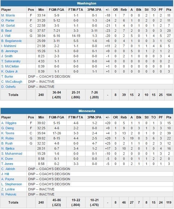 Difficile de battre Minnesota à domicile quand vous avez un Karl-Anthony Towns à 39 points à 17/26 et 13 rebonds et un Ricky Rubio à 22 points à 8/15, 5 rebonds et 19 passes (record en carrière). Les Wizards en ont fait les frais cette nuit avec une défaite 119-104.