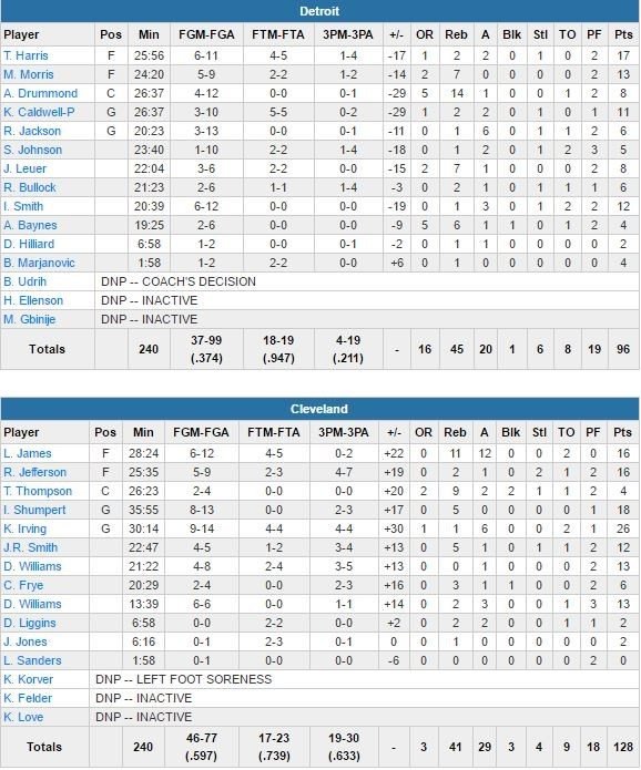 Après une série de 4 défaites en 5 matchs, Cleveland a haussé le ton contre Detroit cette nuit, avec un succès 128-96. LeBron James a enregistré pour l’occasion son 52ème triple-double en carrière (16 points à 6/12, 11 rebonds et 12 passes en 28 minutes) alors que Kyrie Irving ajoute 26 points à 9/14 et 6 passes dans un match largement dominé dès le 1er quart-temps par les champions en titre (44-26 après 12 minutes de jeu).