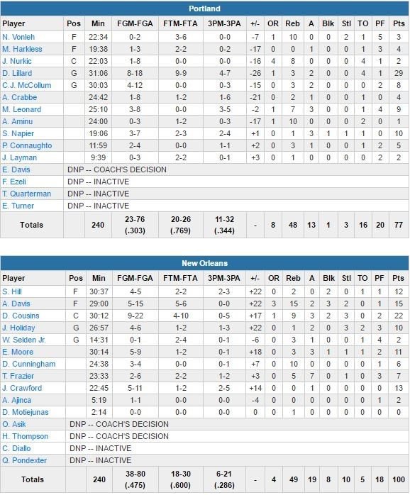 C’est avec une paire Anthony Davis (15 points à 5/15, 15 rebonds et 3 contres) – DeMarcus Cousins (22 points à 9/22 mais 0/5 à 3-points, 9 rebonds, 3 passes et 2 contres) relativement discrète que les Pelicans ont très facilement dominé Portland cette nuit, 100-77.