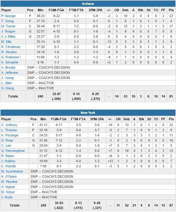 Indiana est devant de 10 points à la mi-temps et shoote à 20/41 mais sera ensuite limité à 12/46 sur les 2 derniers quarts-temps. Menés 59-49 à 9’07 de la fin du 3ème quart-temps, les Knicks vont passer un 18-3 à leurs adversaires pour prendre la tête 64-62 à 52 secondes de la fin de la période. À 1/7 en 1ère mi-temps, Anthony donne 7 points d’avance aux siens (77-70) à 4’13 de la fin. Les Pacers reviendront à 84-79 sur un shoot de Jeff Teague (9 points à 4/15, 8 rebonds, 6 passes mais aussi 7 ballons perdus) mais 3 lancers-francs d’Anthony après une faute de George permet à New York d’assurer la victoire, 87-79 à 18 secondes du buzzer final.