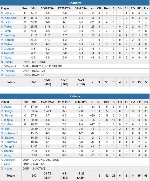 Dominateurs 42-18 dans la peinture, les Hornets, menés par les 20 points de Frank Kaminsky et les 11 points de Marco Belinelli (Kemba Walker est limité à 7 points à 3/11 et 4 passes) sont en revanche limités à 40% aux tirs, contre 53% pour Indiana. Charlotte tentera un comeback avec un 8-2 en début de 4ème quart-temps pour revenir à 10 points mais va encaisser un 14-2 fatal dans la foulée, reprenant 22 points de retard.
