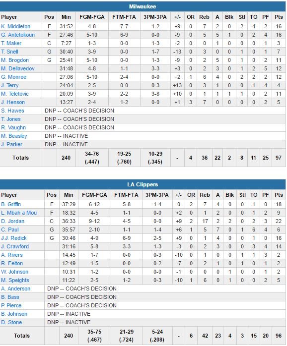Blake Griffin (18 points à 6/12, 7 rebonds et 4 passes) a manqué de peu le tir de la victoire au buzzer. Milwaukee (7ème de la Conférence Est devant Detroit et Miami) compte 11 victoires pour 5 défaites depuis la blessure de Jabari Parker. DeAndre Jordan a été excellent avec 22 points et 17 rebonds mais Chris Paul a lui été limité à 6 points à 2/10, 7 passes et 6 ballons perdus. Les Bucks sont devant de 7 points à 3 minutes de la fin mais plusieurs paniers de Jordan ramènent les Clippers à un point. À 5.1 secondes du buzzer, Los Angeles demande un temps-mort et met en place un système pour Griffin, qui va driver et tenter un shoot court qui manquera sa cible.