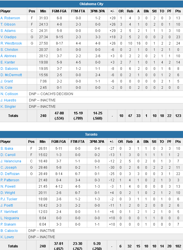 OKC a très vite pris la mesure de son adversaire en prenant une dizaine de points d’avance en premier quart sous l’impulsion d’un Westbrook intenable. Toronto s’est accroché en revenant à 2 points en profitant de la mise au repos de Westbrook, mais à son retour ce dernier a grandement contribué à un 18-6 où il a marqué ou délivré une passe sur tous les points. Résultat à la pause OKC menait 58-48. Incapables de ralentir les Westbrook et l’attaque d’OKC, Toronto a vu le Thunder s’envoler avec 39 points inscrits dans le 3ème pour un score de 97-70 après 3 quart. Les hommes de Billy Donovan ont alors tranquillement déroulé en dernier quart.