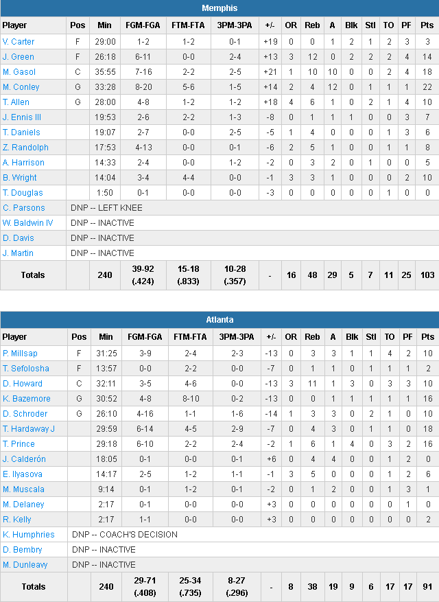 Gasol a donné le ton d’entrée pour son équipe mais la première mi-temps a été très équilibrée et aucune équipe n’a pu faire le moindre mini-break. A la pause le score était logiquement serré, 55-52 Memphis. Le match a basculé dans le 3ème quart puisque Memphis a haussé le ton défensivement et étouffé Atlanta, limité à 12 points. Sur un 13-4 Memphis a fait le break pour prendre 13 points d’avance à l’entame des 12 dernières minutes. Atlanta ne s’en est jamais remis et n’a jamais pu revenir sous les 10 points.