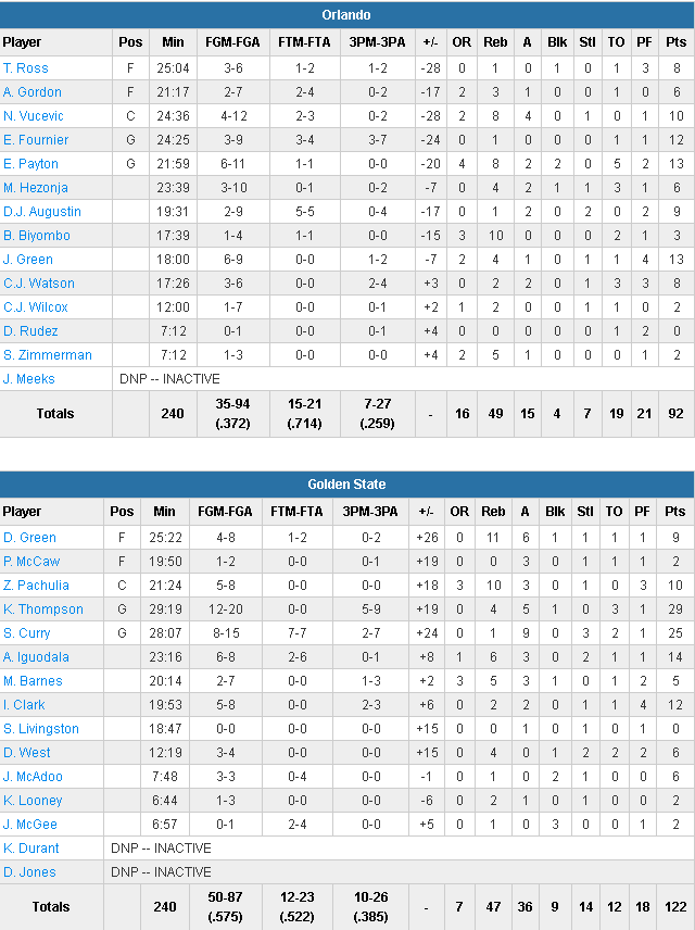 Il n’y a pas eu de match et Steve Kerr en a profité pour mettre un peu au repos ses cadres. Si Klay Thompson confirme qu’il a retrouvé son adresse avec 29 points à 12/20 dont 5/9 )à 3-pts dont 21 points en premier acte, Stephen Curry est toujours en difficulté derrière l’arc avec un 2/7. Il termine toutefois avec 25 points à 8/15 et 9 passes après une petite alerte en début de matchs sur une collision, finalement sans gravité. Andre Iguodala ajoute 14 points, Zaza Pachulia 10 points et 10 rebonds et enfin Draymond Green compile 9 points, 11 rebonds et 6 passes. les champions 2015 shootent à 57.5% dont 10/26 à 3-pts et délivrent pas moins de 36 passes décisives dans ce festival. Orlando est limité de son côté à 37.2% avec 12 points à 3/9 pour Evan Fournier et 13 points pour Elfrid Payton et Jeff Green