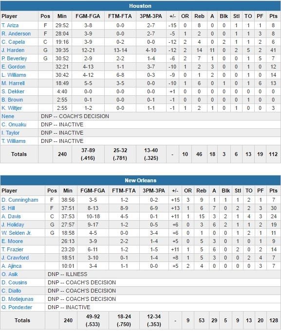 Résultat le triple-double de James Harden passe lui aussi plus inaperçu dans la première défaite en 4 matchs de son équipe malgré une ligne de stats impressionnante : 41 points à 12/21, 14 rebonds et 11 passes. Il a été le seul titulaire de Houston à passer la barre des 10 points (Lou Williams et Montrezl Harrell terminent respectivement à 14 et 13 points en sortie de banc). Les Rockets avaient remporté chacune des deux confrontations précédentes d’au moins 22 points, en rentrant à chaque fois au moins 20 tirs à 3-points. Cette fois, les Pelicans se sont appliqués sur la défense dans le périmètre, laissant certes des pénétrations mais limitant des joueurs comme Eric Gordon (12 points) ou Ryan Anderson (8 points).