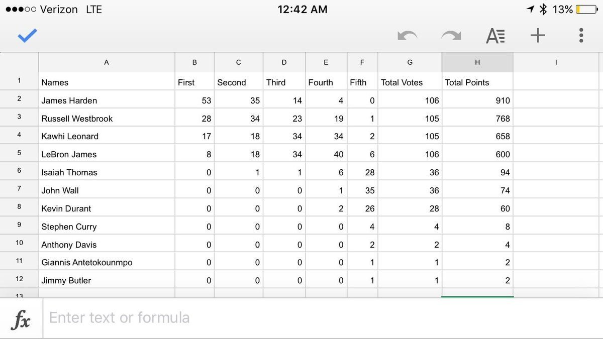 Le vainqueur serait James Harden avec 910 points et 53 premières places, avec une bonne avance sur Russell Westbrook. Ce dernier ne totaliserait que 28 premières places, ce qui nous laisse penser que son bilan collectif devrait lui coûter le titre malgré son triple-double de moyenne. Derrière Kawhi Leonard complète le podium avec 17 premières places, juste devant LeBron James.