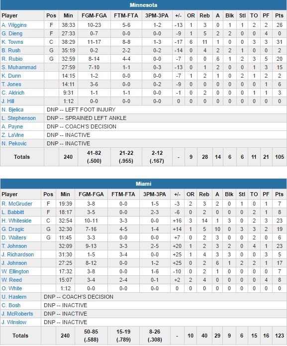 Hassan Whiteside termine à 23 points à 10/11, 14 rebonds et 3 contres, Tyler Johnson 23 points à 9/13 et Goran Dragic 19 points à 7/16, 5 rebonds et 10 passes. Il fallait bien ça pour contrer le trio des Timberwolves composé de Karl-Anthony Towns (31 points à 11/17 et 11 rebonds), Andrew Wiggins (26 points à 10/23) et Ricky Rubio (20 points à 8/14 et 6 passes). Miami n’a pourtant jamais été mené au score dans ce match.