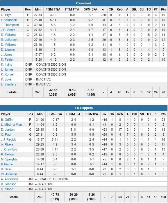 Décevante affiche au Staples Center cette nuit. En visite à Los Angeles, les Cavs ont décidé de reposer LeBron James, Kyrie Irving et Kevin Love pour ce match. Les Clippers, qui avaient eux-mêmes payé le prix fort après avoir mis au repos 2 de leurs stars à Denver, ont ridiculisé cette équipe B des Cavaliers 108-78. Menés par les 23 points (10/17, 8 rebonds et 4 passes) de Blake Griffin, l’équipe met ainsi fin à une série de 3 défaites.