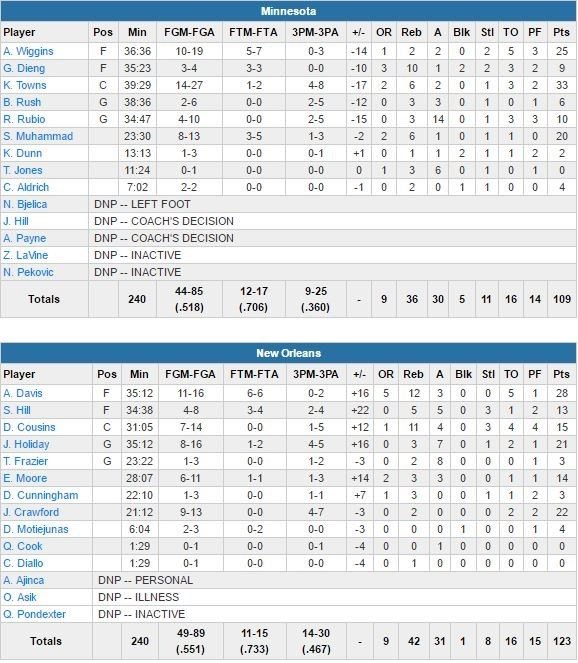 Le nouveau duo et Jrue Holiday (21 points à 8/16, 3 rebonds et 7 passes) jouent mieux ensemble et chacun est plus impliqué qu’au début de l’association des deux All-Stars : 6 joueurs atteignent au moins la barre des 10 points dans ce match, dont Jordan Crawford avec 22 points en 21 minutes. Les Timberwolves perdent de leur côté un 3ème match d’affilée malgré 33 points à 14/27 et 6 rebonds de Karl-Anthony Towns, 25 points d’Andrew Wiggins et 20 de la part de Shabazz Muhammad. Ricky Rubio ajoute 10 points et 14 passes pour Minnesota, qui s’est construit une avance de 13 points dans le 2ème quart-temps avant d’encaisser un 21-10 fatal sur la fin de match.