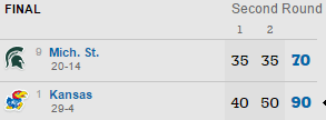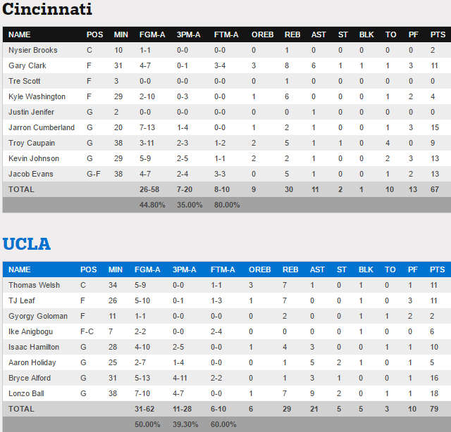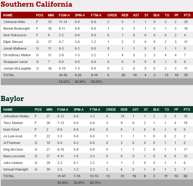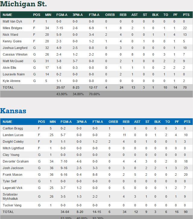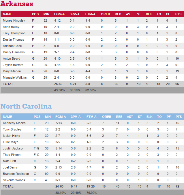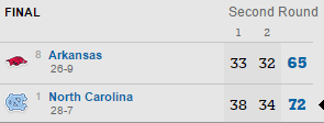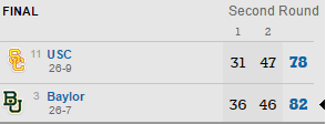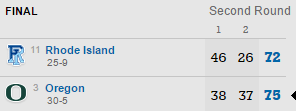 Dans les autres matchs la logique a été respectée puisque Kansas domine sans souci Michigan State, UCLA fait tomber Cincinnati, mais pour les autres ça a été plus compliqué. North Carolina se défait d’Arkansas à la faveur d’un 12-0 pour terminer la rencontre. Malmené par Rhode Island avec 11 points de retard en seconde mi-temps, Oregon finit également fort avec un 7-0 dont 2-pts de Tyler Dorsey pour combler 4 points de retard à 2 minutes du buzzer. Enfin Baylor a passé un 11-5 capital dans le money time pour faire tomber Southern Carolina.