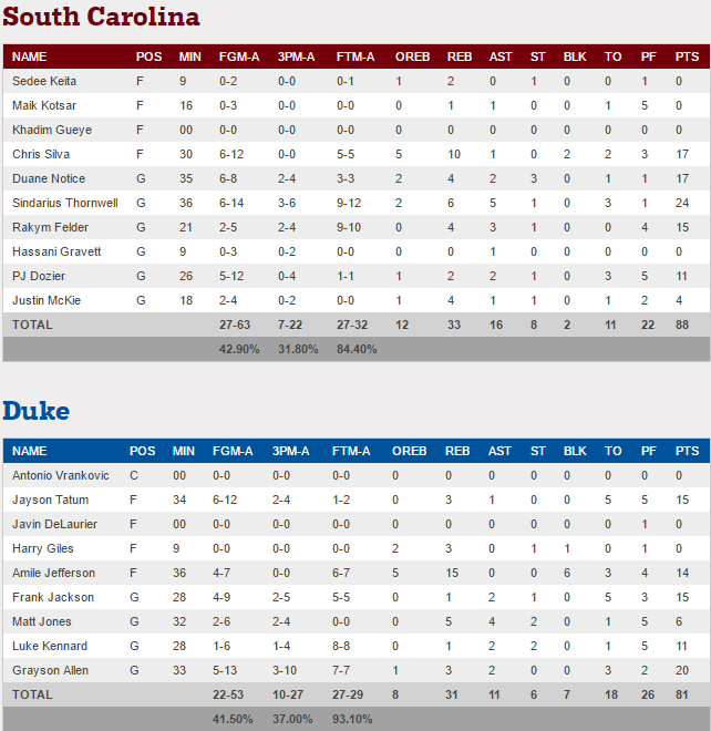 Enorme surprise cette nuit avec la victoire de South Carolina sur les Blue Devils de Duke à la faveur d’une énorme seconde mi-temps durant laquelle ils ont inscrit près de 3 fois plus de points qu’en première avec 65 points. Sous l’impulsion de Sindarius Thornwell (24 pts), Duane Notice (17 pts) et Chris Silva (17 pts) ils ont remonté un retard qui a culminé à 10 points en première mi-temps. Irrésistibles en attaque, ils ont pris les commandes à 12 minutes de la fin et ne les ont jamais lâchées.