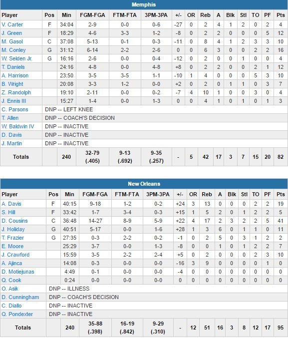Anthony Davis signe lui un beau double-double avec 19 points à 9/18 et 13 rebonds dans ce 5ème succès en 6 rencontres pour Memphis, qui restait de son côté sur une série de 4 victoires. Memphis, mené par les 16 points de Mike Conley (Zach Randolph passe à côté avec 4 points à 2/11 malgré 10 rebonds et Marc Gasol est limité à 10 points à 5/13 et 8 rebonds), encaisse un 61-41 en seconde mi-temps.