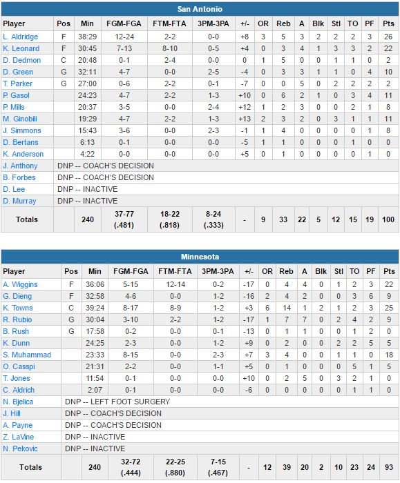 LaMarcus Aldridge termine lui meilleur marqueur de San Antonio avec 26 points à 12/24, 5 rebonds, 3 passes, 2 contres et 2 interceptions. Les Spurs ont su profiter des 23 ballons perdus de leurs adversaires pour marquer 35 points et résister au comeback de Minnesota dans le dernier quart. Karl-Anthony Towns (25 points et 14 rebonds) et les siens (22 points pour Andrew Wiggins, 18 points dont 16 dans le 2ème quart-temps pour Shabazz Muhammad) tombent pour la 4ème fois de suite et voient les playoffs s’éloigner.