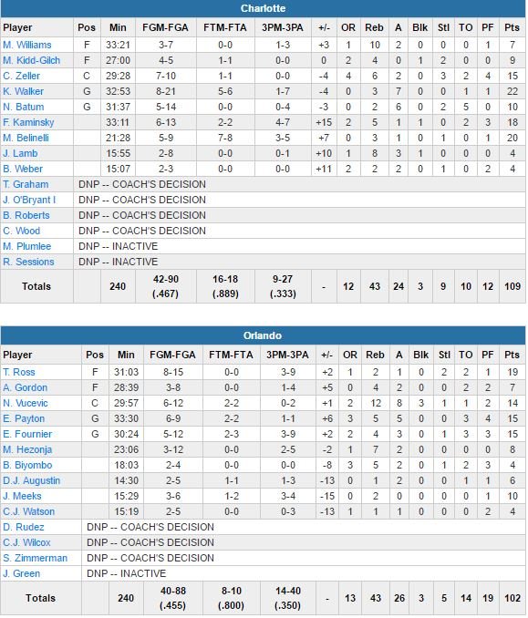 Kemba Walker termine à 22 points à 8/21, 3 rebonds et 7 passes, Frank Kaminsky inscrit 13 de ses 18 points dans le dernier quart. Durant un passage de 5 minutes en fin de 4ème quart, l’ancien de Wisconsin plante 11 points dont trois tirs à 3-points durant un 20-10 qui va permettre aux Hornets de prendre 9 points d’avance à 2’14 de la fin du match. Marco Belinelli en sortie de banc (les remplaçants de Charlotte dominent 46 points à 32) lui aussi a été très précieux avec 20 points à 5/9 et 3 rebonds. Le Magic a lui semblé à court d’énergie dans le dernier quart, période durant laquelle les Floridiens encaissent un 32-20 après avoir terminé le 3ème quart-temps sur une avance de 5 points.