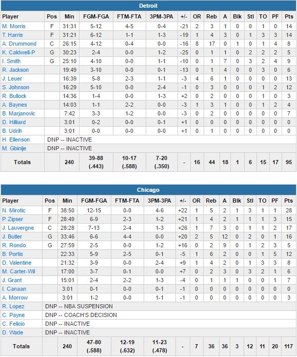 Un temps sorti de la rotation des Bulls cette année, Nikola Mirotic a battu son record en saison cette nuit avec 28 points à 12/15 (4/6 à 3-points) dans la victoire 117-95 de Chicago face à Detroit. Jimmy Butler ajoute 16 points à 6/6, 5 rebonds et 12 passes alors que Joffrey Lauvergne, remplaçant de Robin Lopez (suspendu) a dominé Andre Drummond (8 points à 4/12 et 17 rebonds) avec 17 points à 7/13, 7 rebonds et 3 passes.