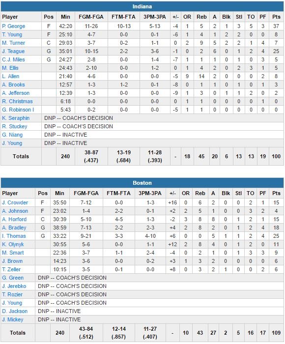 Dans la période l’équipe shoote à 17/25, Thomas score 11 points dont deux 3-points dans la période, George 14 points pour Indiana. L’écart va monter jusqu’à 17 points dans le dernier quart avant un 13-2 en faveur des Pacers (43.7% de réussite) pour revenir à 95-89 sur un 3-points de Teague. Thomas va tuer le match sur plusieurs layups et Horford en rajoutera une couche sur un turnaround pour sceller définitivement le sort du match.