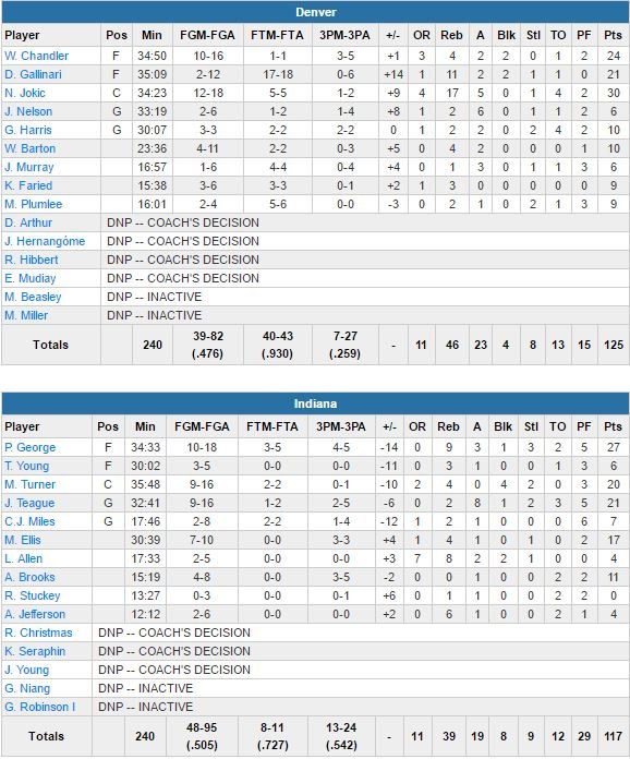 Indiana accueillait cette nuit les Nuggets et son trio à 68 points (27 de Paul George, 21 de Jeff Teague et 20 de Myles Turner) n’a pas été suffisant face à un Nikola Jokic (31 points à 12/18, 17 rebonds et 5 passes) déchaîné et très bien entouré lui aussi : Wilson Chandler marque 12 de ses 24 points dans le 1er quart-temps, Danilo Gallinari 21 points à 2/18 (mais 17/18 aux lancers-francs), 11 rebonds, 2 passes et 2 contres. Denver s’impose 125-117.