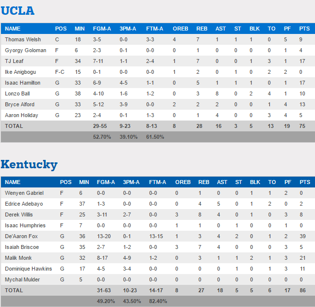 Dans le choc entre UCLA et Kentucky, ce sont les Wildcats qui l’emportent en faisant la différence en seconde mi-temps sous l’impulsion d’un superbe duo De’Aaron Fox (39 pts) – Malik Monk (21 pts). Lonzo Ball termine avec seulement 10 points.