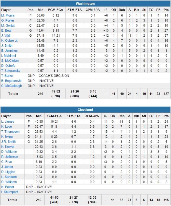 Cleveland (49.4% de réussite contre 59.8% pour Washington), mené de 14 points dans le 1er quart, va se rapprocher à 4 points dans le 4ème quart-temps et ne comptait que 8 points de retard quand Wall a inscrit un layup et Otto Porter Jr claqué dans la foulée le dunk qui a tué le match, 123-111.