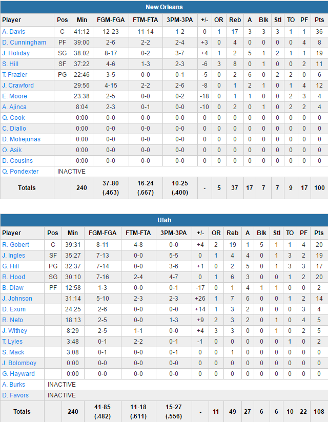 Bête noire de DeMarcus Cousins, Rudy Gobert a cette fois eu fort à faire avec Anthony Davis, qui sort un énorme match avec 36 points à 12/23, 17 rebonds, 3 passes, 3 contres et 3 interceptions, mais le Français continue sur sa lancée avec lui aussi un chantier des deux côtés du terrain : 20 points à 8/11, 19 rebonds et 5 contres. En l’absence de Gordon Hayward, il termine meilleur marqueur avec Rodney Hood, auteur de 20 points à 7/16. Joe Ingles ajoute 19 points, George Hill 17 et Joe Johnson 14 points, 7 rebonds et 6 passes.
