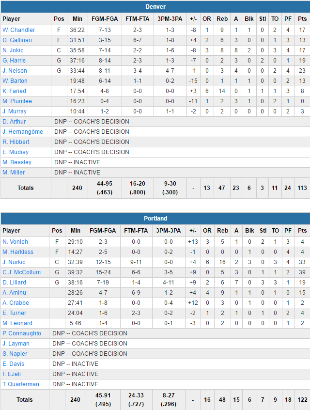 Le grand artisan de ce succès c’est l’ancien Nugget Jusuf Nurkic, qui a sorti le meilleur match de sa carrière avec 33 points (record en carrière) à 12/12, 16 rebonds et 3 contres. CJ McCollum n’a pas été en reste puisqu’il était aussi très chaud avec 39 points à 15/25 dont 3/5 à 3-pts. Damian Lillard apporte sa pierre à l’édifice avec 19 points à 7/19 dont 4/11 à 3-pts, 6 rebonds et 7 passes. Les Blazers ont shooté à un excellent 49.5%, en ne perdant que 9 ballons en plus de 16 rebonds offensifs. Denver a été moins en réussite avec 46.3% et Nikola Jokic a été dominé par son ancien concurrent direct même s’il compile 17 points à 7/14, 8 rebonds et 8 passes. Jameer Nelson inscrit 23 points, Gary Harris 19 et Wilson Chandler 17.