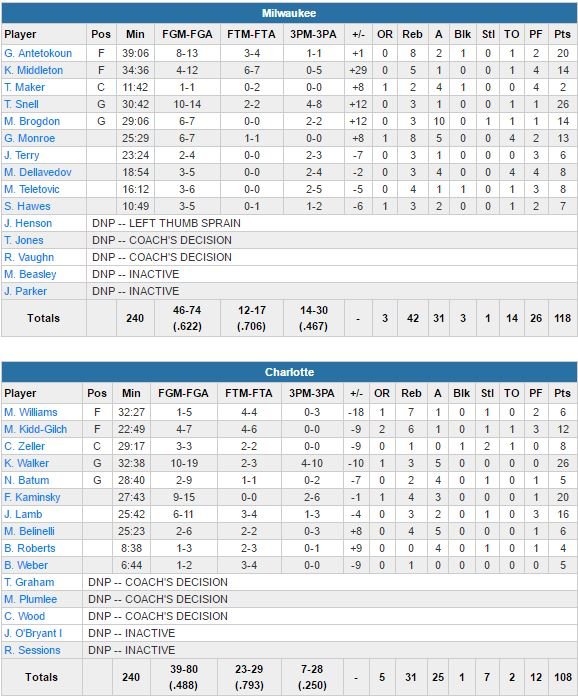 L’équipe de Jason Kidd a rentré 20 de ses 26 premiers tirs et shooté à 73% en 1ère mi-temps, prenant logiquement l’avantage 72-50 à la pause. Snell, Brogdon et Antetokounmpo ont combiné pour un 15/18 aux tirs en 1ère mi-temps pendant que le banc des Bucks (31 passes décisives) shootait à 12/17. En retard de 26 points dans le 2ème quart-temps, Charlotte (désormais à 3 matchs de la 8ème place de la Conférence Est occupée par le Miami Heat) ne parviendra jamais à revenir à moins de 9 unités dans ce match.