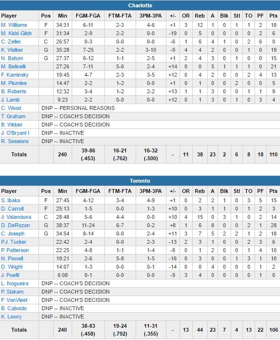 Série de 6 victoires stoppée net pour les Raptors, battus 110-106 par les Hornets de Kemba Walker (11 de ses 19 points dans les dernières 5’03). Le meneur, à 3/18 sur les 3 premiers quarts-temps, a pris le contrôle de la partie dans le dernier quart. Marco Belinelli termine à 21 points pour Charlotte, qui remporte un 5ème match en 7 rencontres. Marvin Williams ajoute 18 points et 12 rebonds. DeMar DeRozan termine à 28 points, Jonas Valanciunas 14 points et 15 rebonds mais les Raptors encaissent un 44-32 fatal dans les 12 dernières minutes. Nicolas Batum termine à 15 points à 6/12, 4 rebonds et 3 passes.