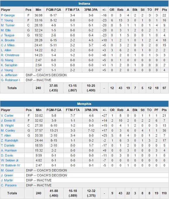 4ème défaite en 5 matchs pour les Pacers, corrigés par Mike Conley et ses 36 points (dont 7 paniers à 3-points) dans la victoire 110-97 des Grizzlies. Vince Carter ajoute 21 points et 8 rebonds, Zach Randolph 17 points. Paul George signe 22 points pour Indiana.