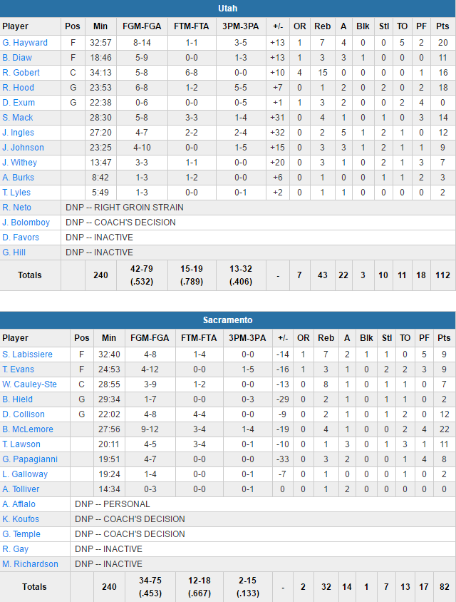 Le collectif et la défense ont une nouvelle fois parlé pour Utah, qui shoote à 53.2% avec 6 joueurs à au moins 10 points et dans le même temps limite les locaux à 82 point pour 45.3% dont 2/15 à 3-pts. Gordon Hayward inscrit 20 points tandis que Rudy Gobert compile 16 points à 5/8 et 15 rebonds, mais sa série de 42 matchs à au moins un contre prend fin. Rodney Hood ajoute 18 points et Boris Diaw 11. En face Ben McLemore est le seul à surnager avec 22 points à 9/12 en sortie de banc.