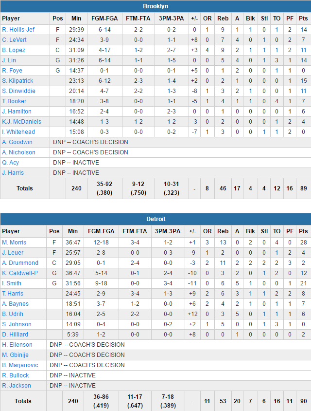 Marcus Morris a mené les siens avec 28 points à 12/18 et 13 rebonds alors qu‘Ish Smith (21 points à 9/18, 6 rebonds et 5 passes) a marqué le 3 points pour passer devant en dernier quart à 28.5 secondes de la fin. Derrière Brook Lopez (11 points à 4/17) a raté le 3 points pour passer devant et Detroit a plié le match sur la ligne des lancers.