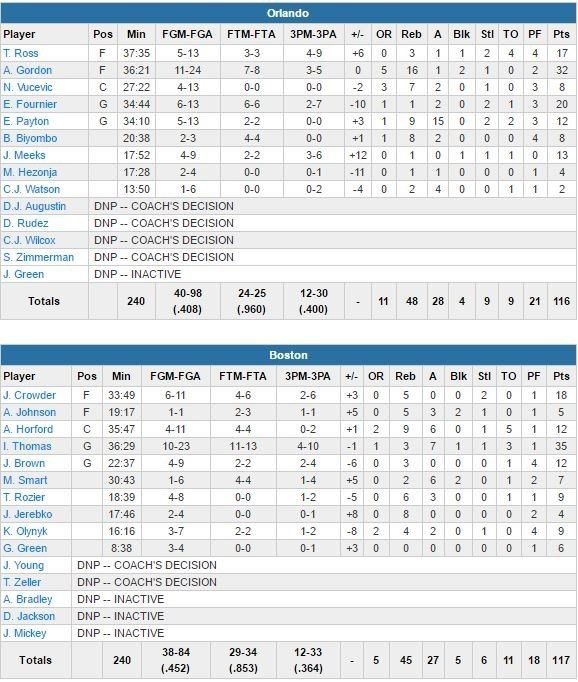 Sifflés par le public car menés de 13 points à 1’50 de la mi-temps, les Celtics vont signer une grosse fin de 2ème quart-temps pour revenir à 64-57 à la pause. Les hommes de Brad Stevens reviendront dominateurs dans le 3ème quart, remporté 36-25. Les 12 dernières minutes seront elles disputées jusqu’au bout. Al Horford donne 1 point d’avance aux siens sur 2 lancers-francs à 1’22. Orlando va ensuite rater 3 shoots, dont un layup pour Elfrid Payton (12 points, 9 rebonds et 15 passes) à 2 secondes de la fin (Orlando avait déjà de ne pas prendre de temps-mort quelques secondes plus tôt).