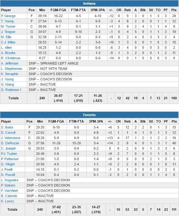 Jonas Valanciunas et Serge Ibaka sont eux en double-double avec respectivement 16 points et 17 rebonds et 15 points et 12 rebonds. Paul George est meilleur marqueur des Pacers avec 28 points (10/22, 9 rebonds et 3 passes), Jeff Teague suit avec 19 points (4/9, 4 rebonds et 5 passes) mais les Pacers restent bredouilles au Canada depuis le 1er mars 2013. Kevin Seraphin n’a pas joué.