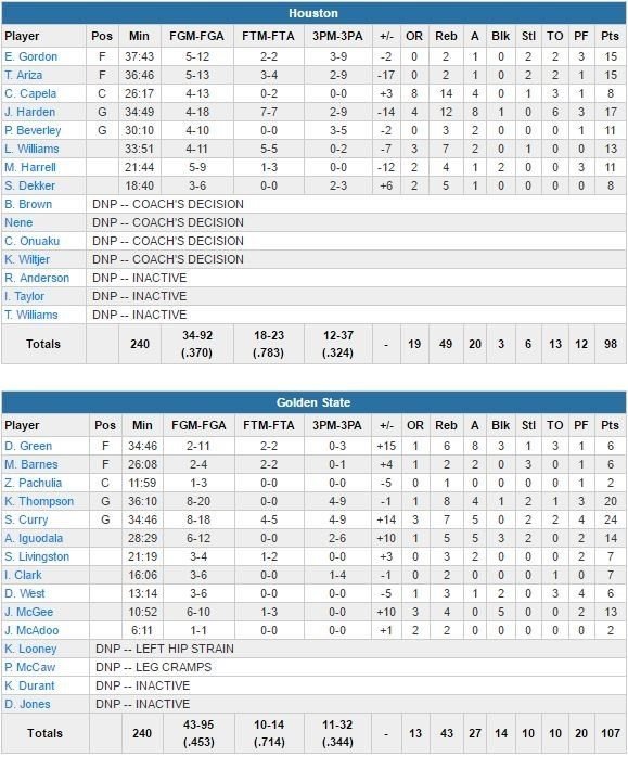 JaVale McGee a été précieux en sortie de banc pour les Warriors (déjà vainqueurs à Houston 113-106 mardi) avec 13 points et un record en saison de 5 contres en sortie de banc. Devant 61-56 à la mi-temps malgré un 10-2 encaissé pour terminer le 2ème quart-temps (Andre Iguodala, 14 points à 6/12, 5 rebonds, 5 passes, 3 contres et 2 interceptions, plante un buzzer un 3-points, les Rockets (38/147 à 3-points en 4 confrontations contre les Warriors cette saison) comptent encore 2 points d’avance à l’entame du 4ème quart-temps, 85-83. Iguodala va ensuite égaliser sur un layup main gauche à 7’07 avant que Ian Clark ne rentre un 3-points important à 5’58 et Matt Barnes un panier clutch dans les dernières minutes. Au final, les Rockets seront limités à seulement 13 points dans les 12 dernières minutes (ils en avaient marqué 36 dans le 2ème).