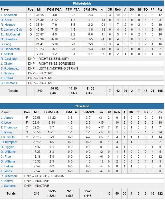 À noter : Dario Saric a été limité à 3/12 (1/7 à 3-points) aux tirs. Richard Jefferson (tendinite au genou gauche) et Kyle Korver (genou gauche douloureux) n’ont pas joué pour les Cavs.
