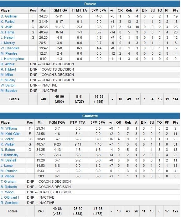 Denver (désormais 2 matchs de retard sur les Blazers, qui possèdent en plus le tiebreaker) a dominé 52 points à 32 dans la raquette mais n’a pas su rentré des shoots simples au moment où il le fallait dans ce match. Les Hornets ont shooté à 17/36 à 3-points, dont un 7/12 dans le dernier quart pour revenir à 2 matchs d’Indiana, actuellement 8ème de la Conférence Est. Mené de 8 points après 3 quarts-temps, Charlotte se remet dans le match et en prend même le contrôle en début de 4ème quart grâce à un 12-0.