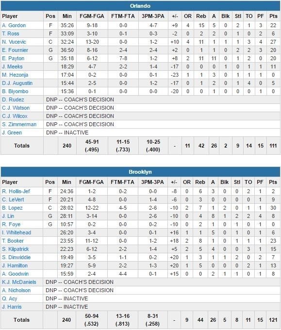 Avec un Brook Lopez à 30 points à 12/22 et 7 rebonds, un Trevor Booker à 23 points (record en saison) à 11/12 et 8 rebonds et un domination aussi nette dans la peinture (72-32) qu’en sortie de banc (72-16), les Nets l’ont logiquement emporté 121-111 face au Magic cette nuit.