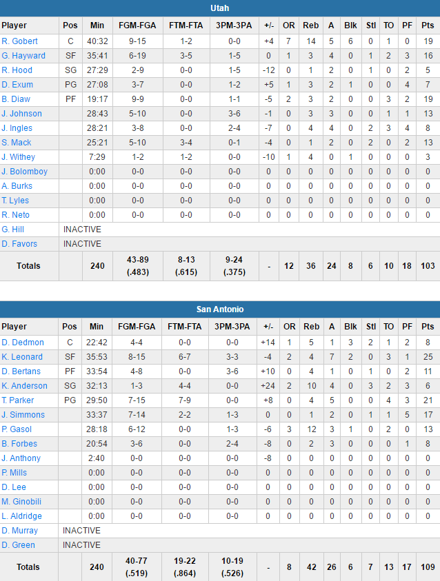 Les Texans ont fait la différence dans le 3ème quart sous l’impulsion d’un énorme Kawhi Leonard, auteur de 19 de ses 25 points (8/15 dont 3/3 à 3-pts, 4 rebonds et 7 passes) en 3ème acte. Les Français ont particulièrement brillé dans ce match avec 19 points à 9/9 en 19 minutes pour Boris Diaw, 21 points à 7/15, 4 rebonds et 5 passes de Tony Parker, et 19 points à 9/15, 14 rebonds, 5 passes et 6 contres pour Rudy Gobert. Les Spurs ont shooté à 51.9% sur le match dont un 10/19 à 3-pts et ont pu compter sur un excellent apport des remplaçants Pau Gasol (13 points et 12 rebonds) et Jonathon Simmons (17 points). Côté Jazz, la défense a fait défaite et Gordon Hawyard sort un match moyen avec 16 points à 6/19.