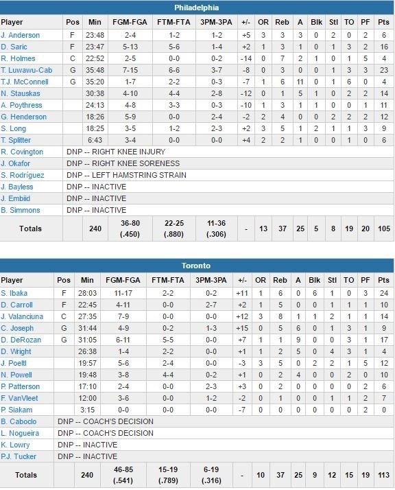 En face et pour un 2ème match consécutif, le Français Timothé Luwawu-Cabarrot a battu son record de points en carrière avec 23 points à 7/15 et 3 rebonds en 35 minutes. Vendredi, le Cannois avait signé 19 points dans une défaite contre Cleveland. Dario Saric (ralenti par une douleur au telon droit) termine lui à 16 points à 5/13. Toronto (privé de P.J. Tucker, touché au genou gauche) va prendre jusqu’à 17 points d’avance sur un lancer-franc de Norman Powell à 3’49 mais les Sixers vont enchaîné sur un 11-0 alors que Toronto repose ses starters en fin de match. Ce sera finalement Jakob Poeltl qui effacera les espoirs de comeback des visiteurs sur un dunk.