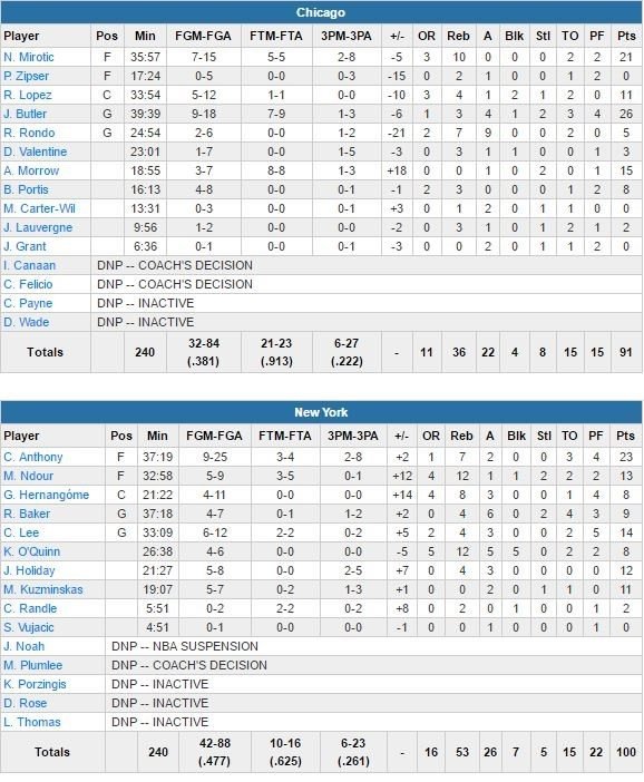Les Bulls, limités à 38.1% (47.7% pour New York), perdent aussi 15 ballons et sont désormais à égalité avec Indiana à l’Est (7ème place). Jimmy Butler termine meilleur marqueur de l’équipe avec 26 points (9/18, 3 rebonds et 4 passes), suivi de Nikola Mirotic (21 points à 7/15 et 10 rebonds). New York (avantage 53-36 au rebond) a pris le contrôle du match dans le 2ème quart-temps, remporté 25-16. Les Knicks (55% en 1ère mi-temps contre 33% pour Chicago) mènent ensuite 54-40 à la mi-temps. Carmelo Anthony marque 8 points dans le 3ème quart pour maintenir une avance conséquente (80-64) pour aborder tranquillement la fin de match.