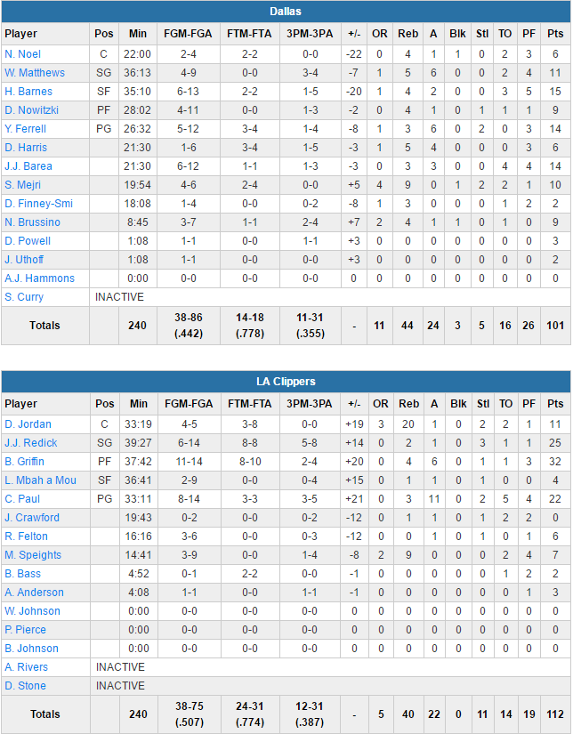 Comme souvent les Californiens se sont appuyés sur leur quatuor Blake Griffin (32 points à 11/14 dont 2/4 à 3-pts et 6 passes), Chris Paul (22 points à 8/14 et 11 passes), JJ Redick (25 points à 5/8 à 3-pts) et DeAndre Jordan (11 points et 20 rebonds). L’attaque californienne a très bien fonctionné avec 50.7% au tir, alors que Dallas a moins été en réussite avec 44.2%. Aucun Mav ne marque plus de 15 points puisque Harrison Barnes est le meilleur scoreur (15 points à 6/13), épaulé par les 14 points des deux meneurs JJ Barea et Yogi Ferrell. Dirk Nowitzki signe seulement 9 points à 4/11.