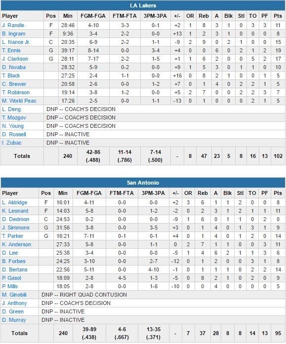 Les Lakers n’ont jamais été menés une fois dans ce match et se sont fait plaisir niveau show, prenant jusqu’à 15 points d’avance pour mettre fin à une série de 8 défaites contre San Antonio, qui jouait sans Danny Green et Manu Ginobili (quadriceps). Sauf que Kawhi Leonard (11 points en 14 minutes) et LaMarcus Aldridge (8 points et 6 rebonds en 16 minutes) n’ont pas joué la seconde mi-temps sur décision de Gregg Popovich. Toujours est-il que pour un deuxième match consécutif, San Antonio (dominé 58 points à 38 dans la raquette) a enregistré son plus petit total sur un 1er quart-temps (remporté 31-14 par les Lakers) cette saison avec 14 points. À la baguette, Ennis signe 5 points, 2 passes et aucune perte de balle dans le 1er quart. Larry Nance Jr (15 points à 6/9 et 9 rebonds) cumule lui 6 points et 2 rebonds sur les 4 premières minutes de la rencontre.