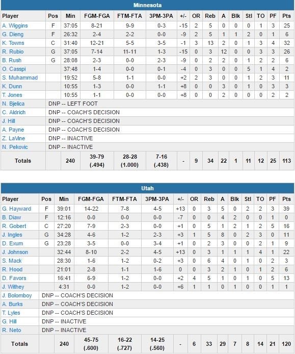 L’ailier All-Star et Joe Johnson (22 points à 8/10 et 3 rebonds) ont été les leaders scoring (8/10 à 3-points à eux deux) d’un 3ème quart-temps décisif remporté 40-28. Utah a pris l’avantage pour de bon dans la période au terme d’un 16-7. Et à chaque tentative de retour de Minnesota, Hayward avait la réponse pour le Jazz, à 60% aux tirs sur la rencontre, histoire de rattraper une défense pas autant au rendez-vous que d’habitude. Karl-Anthony Towns signe 32 points (12/21) et 13 rebonds, Ricky Rubio 26 points (7/14, 12 passes) et Andrew Wiggins 25 points (8/21, 5 rebonds).
