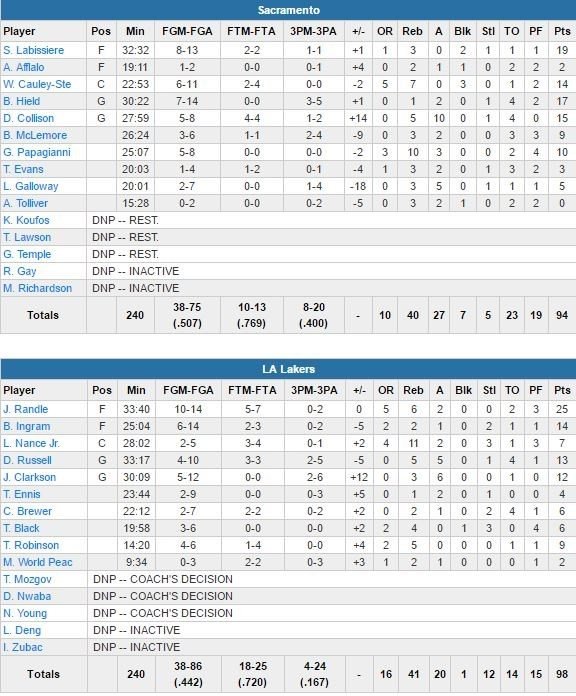 Les Lakers ont de leur côté battu Sacramento en ayant fait la différence sur les 3 derniers quarts-temps suite à un début de match cata (31-18 encaissé dans le 1er quart-temps). Julius Randle termine meilleur marqueur avec 25 points à 10/14 et 6 rebonds et les 9 autres joueurs entrés en jeu pour Los Angeles ont tous inscrit au moins 2 points. Fébriles en fin de match, les hommes de Luke Walton s’en sont sortis notamment grâce à une interception de Corey Brewer dans les dernières secondes et sur une remise en jeu des Kings.