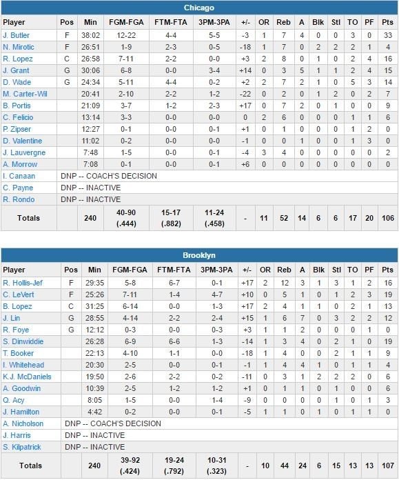 Spencer Dinwiddie a signé 4 lancers-francs dans les dernières 13.6 secondes du match pour les Nets et termine à 19 points (6/9, 3 rebonds et 4 passes), tout comme le rookie Caris LeVert (7/11, 4 rebonds). Jimmy Butler termine meilleur marqueur des Bulls avec 33 points (12/22, 7 rebonds et 4 passes). Chicago va encaisser 32 points dans le dernier quart et un 10-0 dans le money time. Dinwiddie mettant fin à une égalité 103 partout sur 2 lancers. Butler rate ensuite un jump shot puis Dinwiddie tue le match avec 2 nouveaux lancers à 2.4 secondes. Rondae Hollis-Jefferson termine à 16 points et 12 rebonds et Brook Lopez 13 points pour ce dernier match de l’année au Barclays Center, à guichets fermés (17 732 personnes).