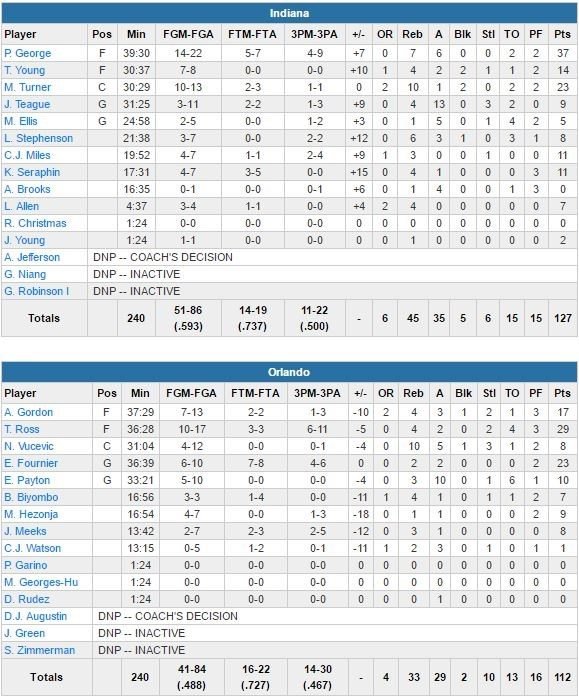 Le Magic de Terrence Ross (29 points), Evan Fournier (23 points), Aaron Gordon (17 points) et Elfrid Payton (10 points et 10 passes) perd de son côté un 6ème match en 7 rencontres. George, Thaddeus Young (14 points à 7/8, 4 rebonds, 2 passes et 2 contres) et Turner vont combiner pour un 20/24 aux tirs (83.3%) en 1ère mi-temps pour donner à Indiana une avance confortable, 68-59. Gordon et Ross ramènent Orlando à 84-80 à 4 minutes de la fin du 3ème quart-temps mais le Magic ne se rapprochera pas plus près en seconde mi-temps. Indiana boucle la période sur un 15-2 avec un and one signé Kevin Seraphin (11 points à 4/7 et 4 rebonds en 17 minutes). C.J. Miles (11 points à 4/7 et 3 rebonds) rentre un 3-points pour démarrer le 4ème quart-temps et Indiana atteint la barre des 10 points d’écart sans plus jamais être menacé.