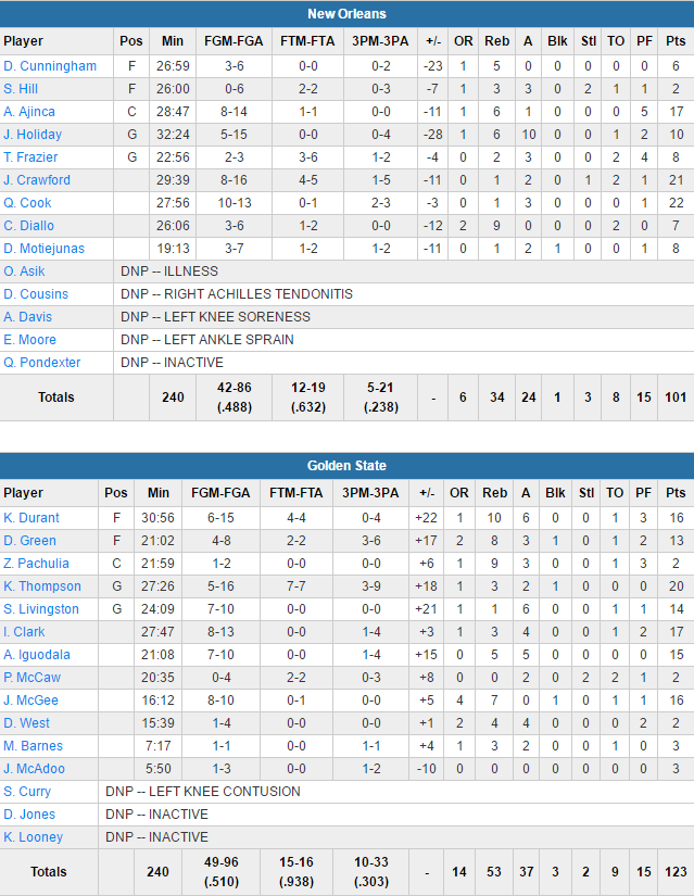 Kevin Durant a effectué un bon retour avec 16 points à 6/15, 10 rebonds et 6 passes alors que 6 autres Warriors inscrivent au moins 13 points. Klay Thompson termine avec 20 points à 5/16, Ian Clark 17 points à 8/13, JaVale McGee 16 points à 8/10, Andre Iguodala 15 points à 5/10 et enfin Draymond Green 13 points à 4/8. Les Californiens se sont baladés avec 51% au tir, 37 passes décisives (ils deviennent la seconde équipe de l’histoire après les Lakers 84-85 à réussir 50 matchs à au moins 30 passes décisives) pour seulement 9 ballons perdus et 53 rebonds à 34. En face pour les Pelicans, Alexis Ajinça signe 17 points à 8/14 alors que Quinn Cook plante 22 points et Jordan Crawford 21.